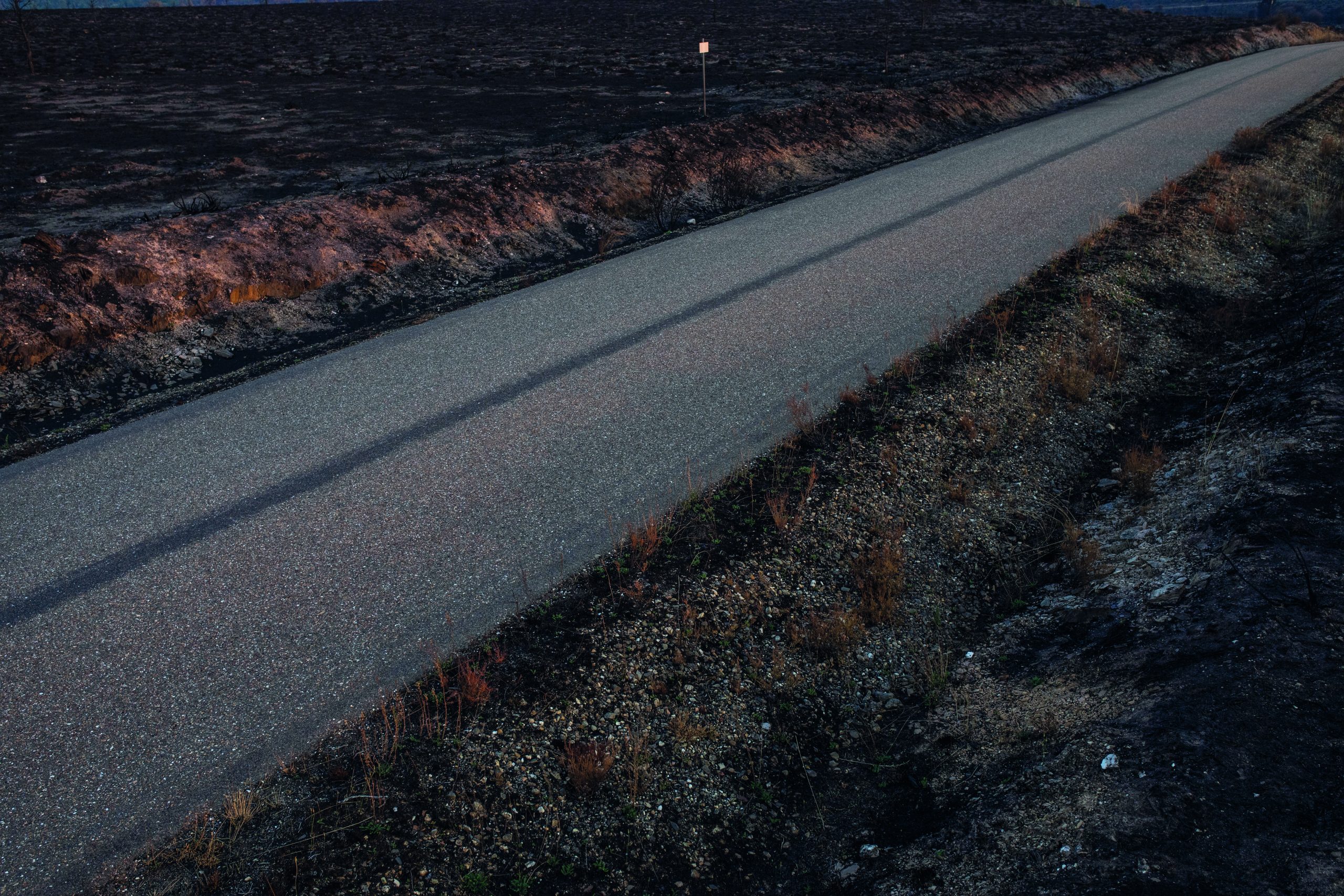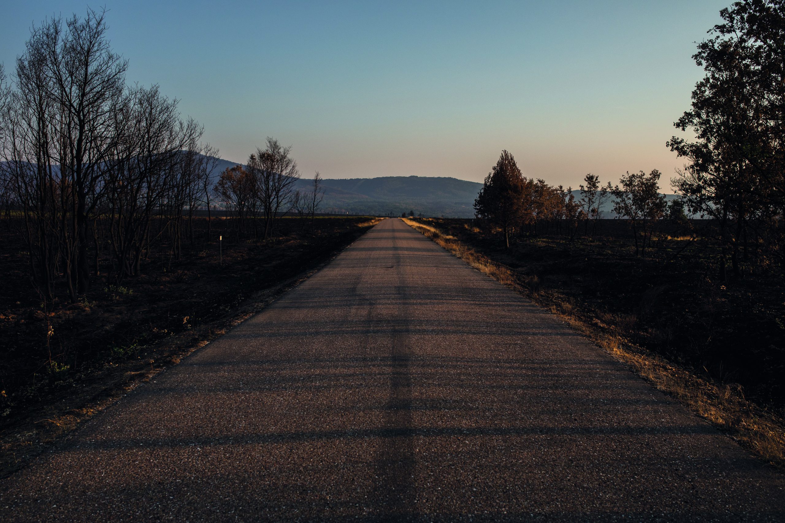 El día que visitamos la zona, el 21 de julio, en las carreteras que conectan las cuatro comarcas que abarca la sierra (Carballeda, Sanabria, Aliste y Tábara) no se oye nada. No hay pájaros cantando en las ramas de los castaños o los pinos, ni tampoco el zumbido de insectos o lobos aullando más allá de las lindes; no se oyen chasquidos de ciervos, corzos u otros animales agazapados entre el matorral. Las hojas secas cruzan la calzada como si fueran ceniza blanca. Todo huele a quemado y las huellas que dejan los zapatos quedan impresas en negro.